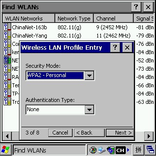 6繼續點“Next”,出現“Security Mode”“Authentication Type”的設置,這里需要注意的是,這兩個選項與具體的無線網絡設置有關,最好進入無線路由器的管理界面里弄清楚無線設置,一般Security Mode“WPA2 - Personal”Authentication TypeNone