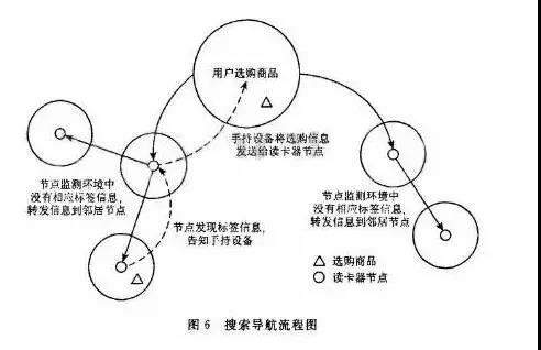 當選擇好商品后,手持設備將購置信息傳給讀卡器節點,讀卡器節點讀取其監測環境中的標簽信息,如果某讀卡器節點范圍內沒有相關物品信息,則傳送信息給其鄰居讀卡器節點,直到找到相關物品。同時將物品的位置信息返回手持設備,獲取當前位置信息和物品信息,自動選擇一條最優路徑引導顧客購物。搜索導航流程圖如圖6所示。